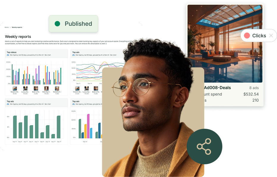 If you work with a team, clients, or partners, Superads lets you generate stunning creative reports in 1 click: